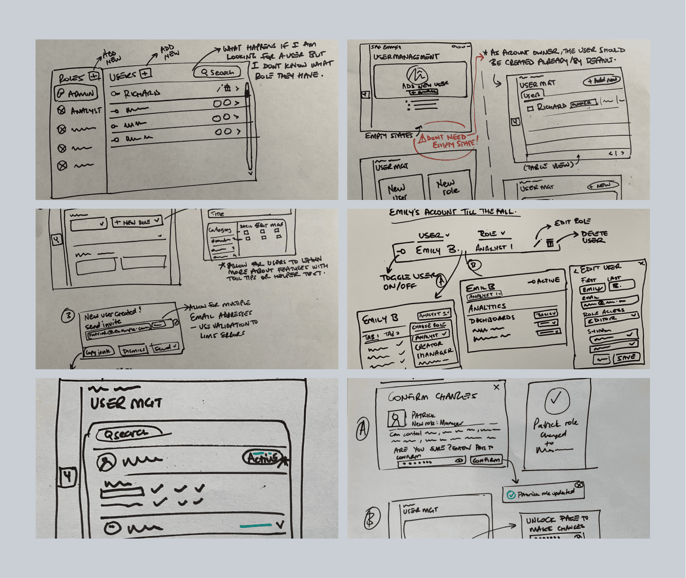 I explored various layouts and workflows through sketches; Layout explorations (table views, list views, accordions, cards) to show context easily, forms, status and confirmation components.